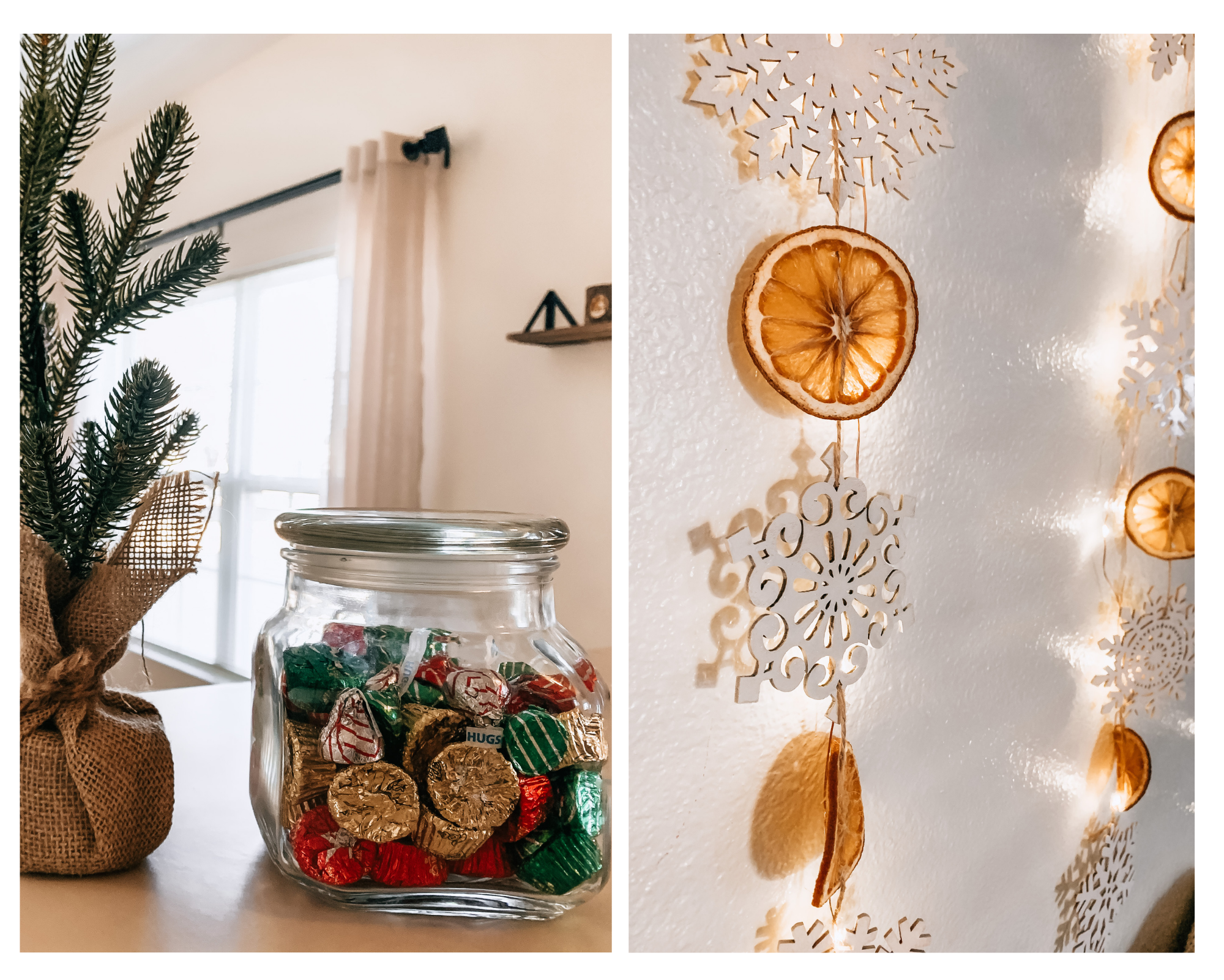 I love decorating for holidays, but I also don't like to get overwhelmed with it, so I usually keep it simple, functional, and cute. Along with our regular yearly Christmas decor that we set out, we add little things here and there. This year I decided to get crafty with some wooden snowflakes and dried oranges. Super simple, budget-friendly, and very cute.